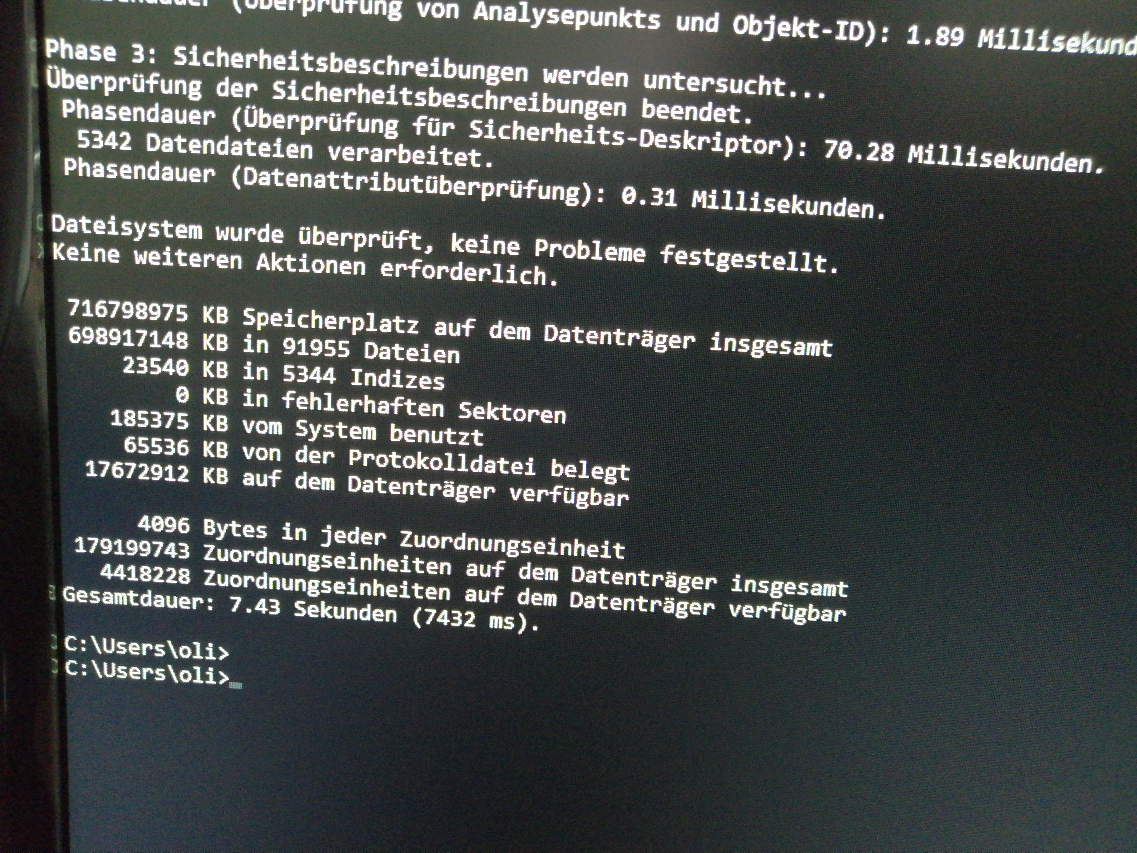 Das Bild von der cmd Datei ist dass was er mir gegeben hat als ich e auf Fehler überprüft habe wo angeblich laut Eigenschaften von lokalen datenträger welche waren aber mir in der cmd angezeigt wird dass ich keine habe. (berichtigt mich wenn ich falsch liege)