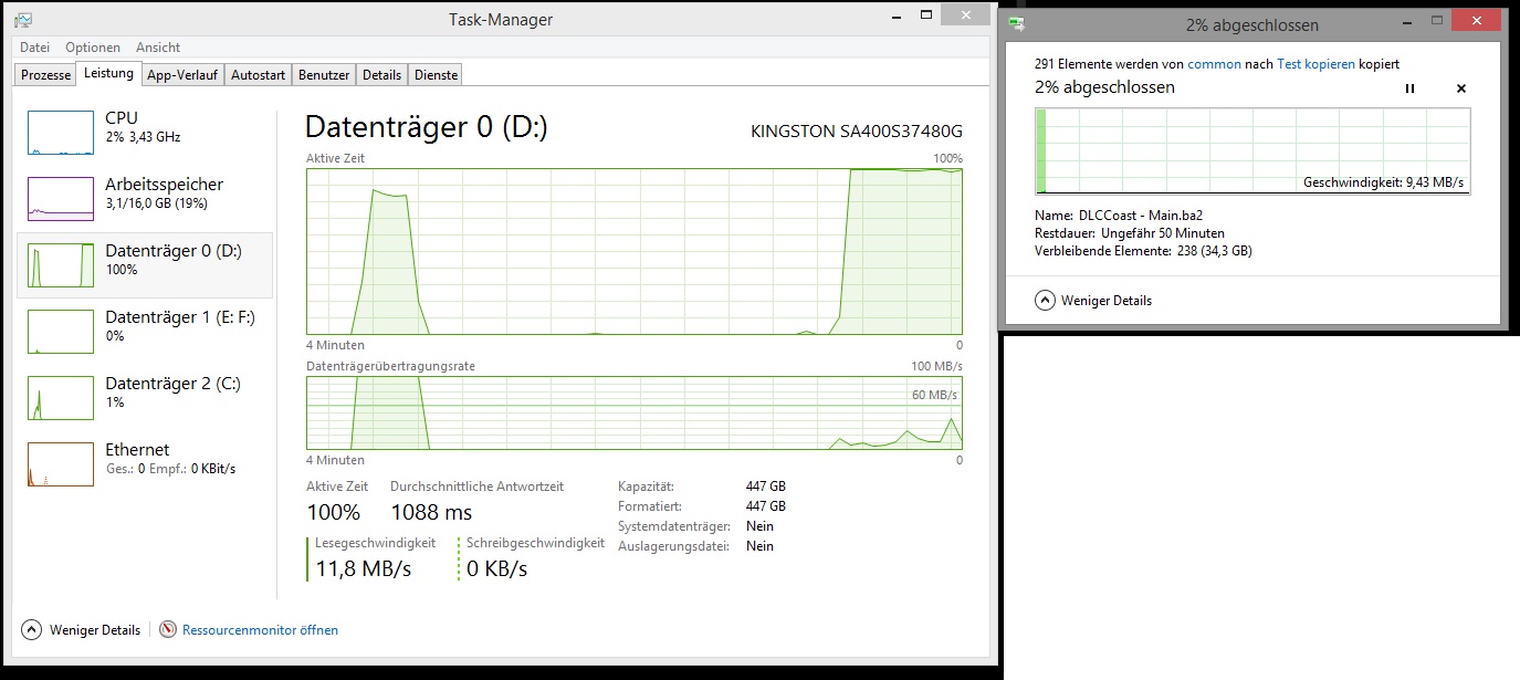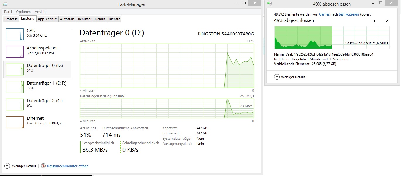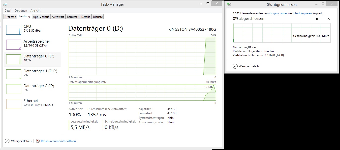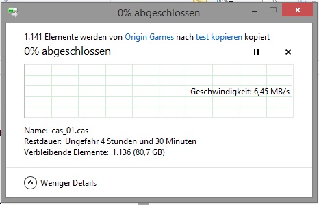 Daraufhin habe ich versucht, mehr Speicher auf der Spiele SSD freizumachen und hab versucht ein Spiel mit 80 Gigabyte auf meine HDD zu kopieren. Ich habe früher schon oft große Datenmengen von der SSD auf die HDD kopiert, ohne probleme.