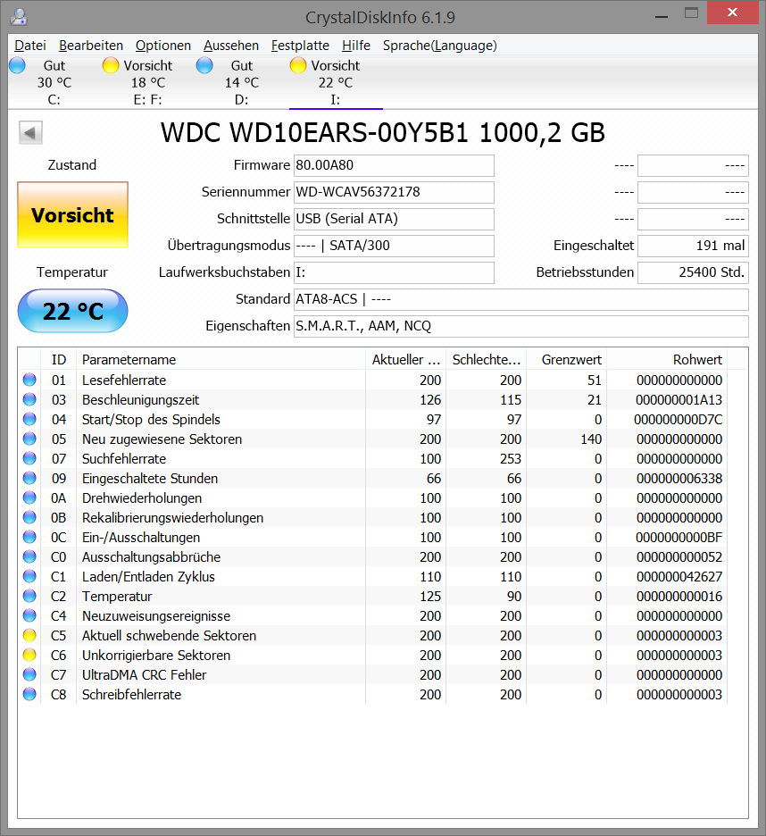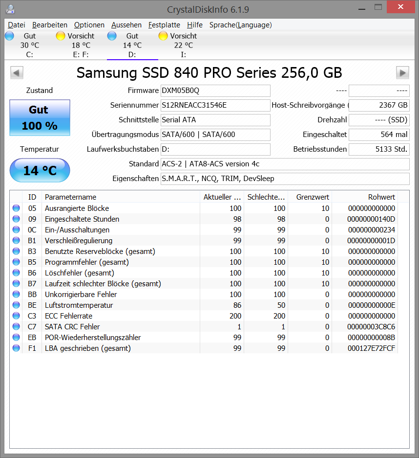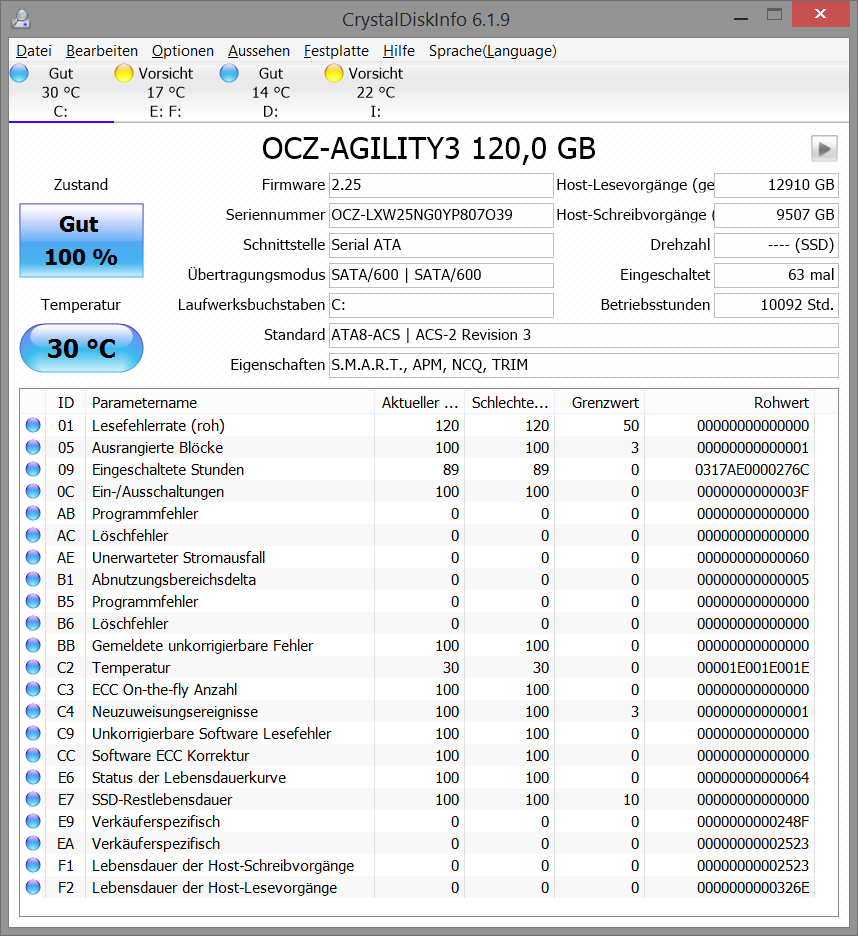 Sorry, aber die CRC Fehler haben mit dem Superfetch nichts zu tun, dass ist ein HW Problem der Kommunikation zwischen dem SATA Host Controller (also i.d.R. dem Chipsatz) und dem Controller der Platte (SSD/HDD). Wenn der Rohwert von C7 steigt, besteht da Handlungsbedarf. Deine Änderung hat nun vermutlich bewirkt, dass Windows vorab die nötigen Dateien ins RAM geladen hat, womit Dir nicht mehr auffällt ob das schnell oder langsam geschehen ist, aber die Ursache wären davon nicht beseitigt und daher solltest Du die S.M.A.R.T. Werte und vor allem den Rohwert von C7 im Blick behalten.