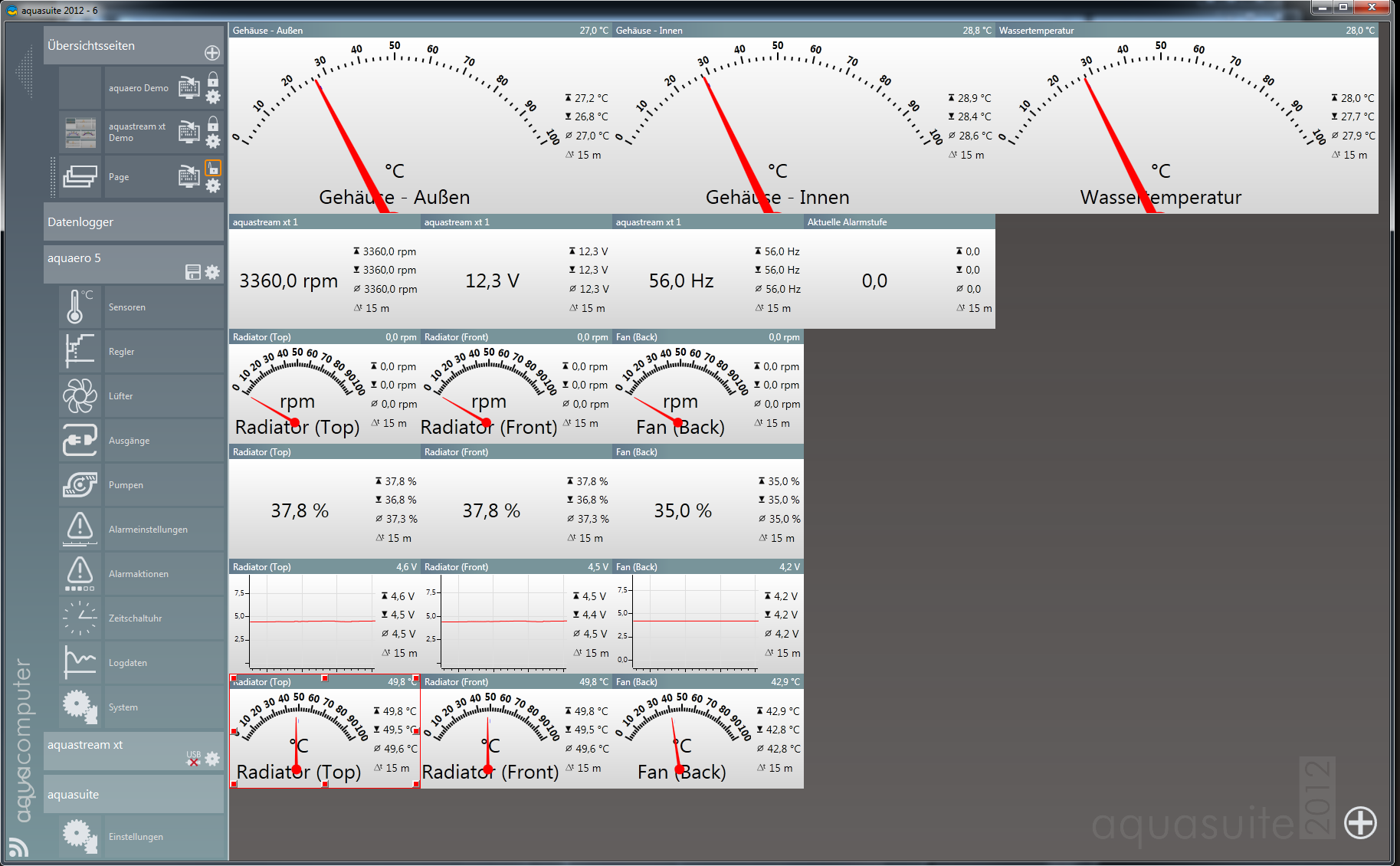 Aquaero 5: Ich habe mich aus Kostengründen für die Version ohne Display entschieden. Die Installation ist sehr einfach, einfach Schritt für Schritt die Kurzanleitung befolgen und mit der Aquastream verbinden (3pin Kabel). Die Aquaero 5 hat 4 Lüfterausgegänge, ich habe 3 davon angeschlossen. Back(1Lüfter), 360er(3Lüfter), 240er(2Lüfter). Ihr könnt ruhig 1-3 Lüfter Parallel auf einen Kanal klemmen. Beim Anschließen des USB Kabels wirklich genau Prüfen ob ihr das richtig rum angeschlossen habt. An der Aquaero selbst einfach farblich passend aufstecken, beim Mainboard nachlesen was GND und V+ ist! Die Lüfter werden, bis ihr sie eingestellt habt auf 100% laufen (Aquasuite Software)