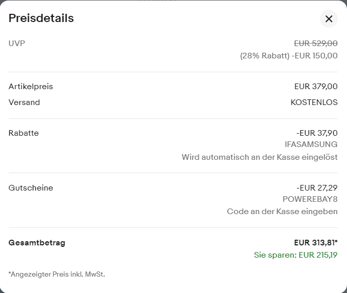 Gerade in diesem Moment, während des Verfassens des Beitrages, ist übrigens die Preisgestaltung bei Verkäufer "Samsung Deutschland" (via Ebay) für das A55 5G (8/256) Iceblue wie folgt: