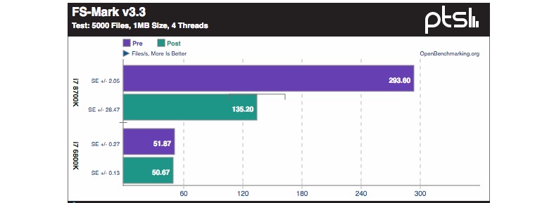 When it comes to 4K Random Write performance the ASUS Maximus IX Hero Z270 board had the highest score of the bunch with 57,289 IOPS at QD1. This is a 48.1% increase in IOPS over the ASUS Sabertooth X99 board. Massive performance difference! The AMD X370 and X399 platforms were tested with the latest chipset drivers (17.30) and the Random Write performance was notably lower than what we were seeing on Intel platforms. The AMD X370 platform we used had awful 4K Random Write performance at QD16 for some reason. We have seen folks saying that AMD’s 4K random disk performance on PCIe and especially SATA is way behind Intel for some time now and it does look like PCIe performance is generally slower.