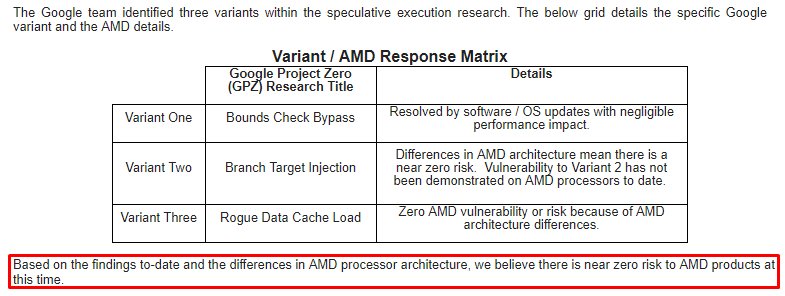 To be clear, the security research team identified three variants targeting speculative execution. The threat and the response to the three variants differ by microprocessor company, and AMD is not susceptible to all three variants. Due to differences in AMD's architecture, we believe there is a near zero risk to AMD processors at this time. We expect the security research to be published later today and will provide further updates at that time.