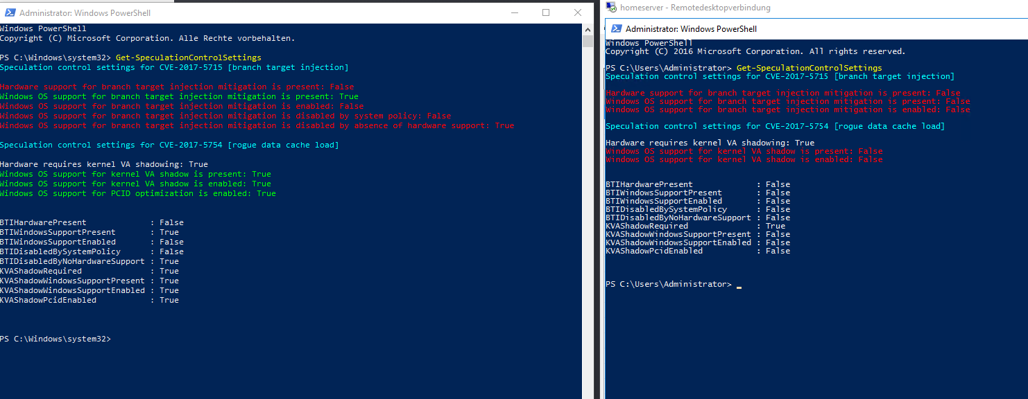 Windows OS support for branch target injection mitigation is disabled by absence of hardware support: True