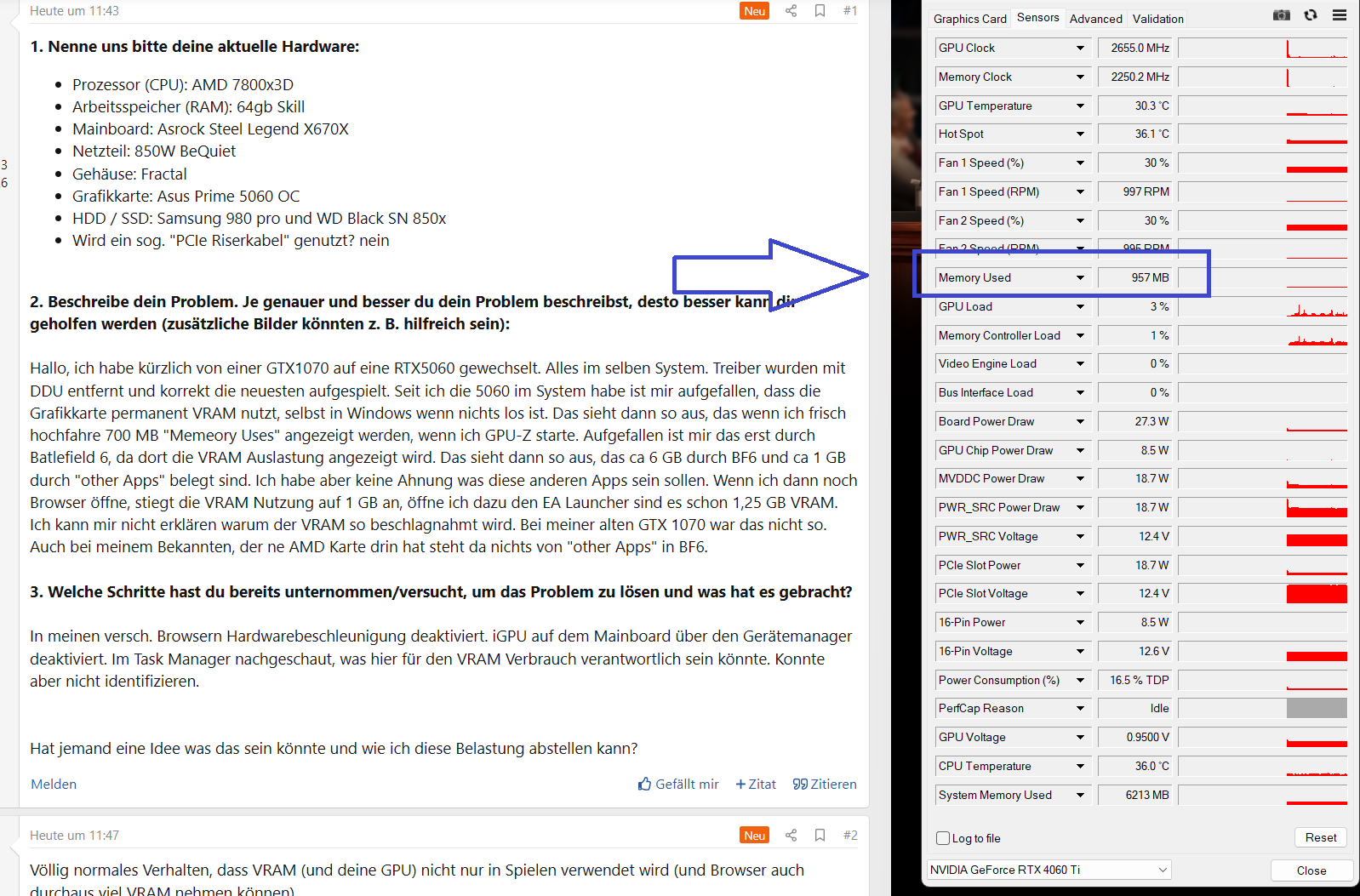 Hallo, ich habe kürzlich von einer GTX1070 auf eine RTX5060 gewechselt. Alles im selben System. Treiber wurden mit DDU entfernt und korrekt die neuesten aufgespielt. Seit ich die 5060 im System habe ist mir aufgefallen, dass die Grafikkarte permanent VRAM nutzt, selbst in Windows wenn nichts los ist. Das sieht dann so aus, das wenn ich frisch hochfahre 700 MB "Memeory Uses" angezeigt werden, wenn ich GPU-Z starte. Aufgefallen ist mir das erst durch Batlefield 6, da dort die VRAM Auslastung angezeigt wird. Das sieht dann so aus, das ca 6 GB durch BF6 und ca 1 GB durch "other Apps" belegt sind. Ich habe aber keine Ahnung was diese anderen Apps sein sollen. Wenn ich dann noch Browser öffne, stiegt die VRAM Nutzung auf 1 GB an, öffne ich dazu den EA Launcher sind es schon 1,25 GB VRAM. Ich kann mir nicht erklären warum der VRAM so beschlagnahmt wird. Bei meiner alten GTX 1070 war das nicht so. Auch bei meinem Bekannten, der ne AMD Karte drin hat steht da nichts von "other Apps" in BF6.