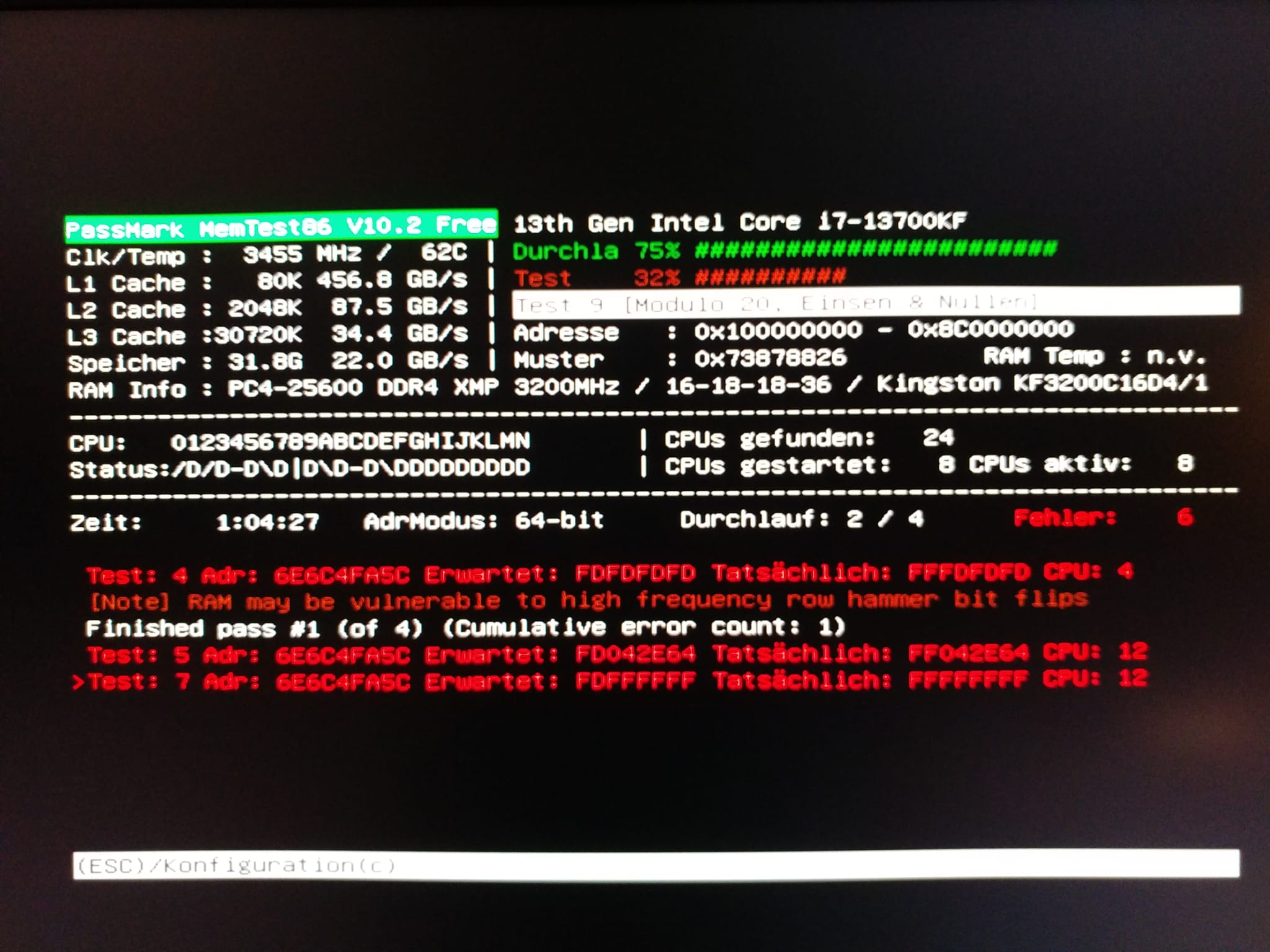 Deshalb habe ich jetzt mal Memtest laufen lassen und schon einige Fehler.