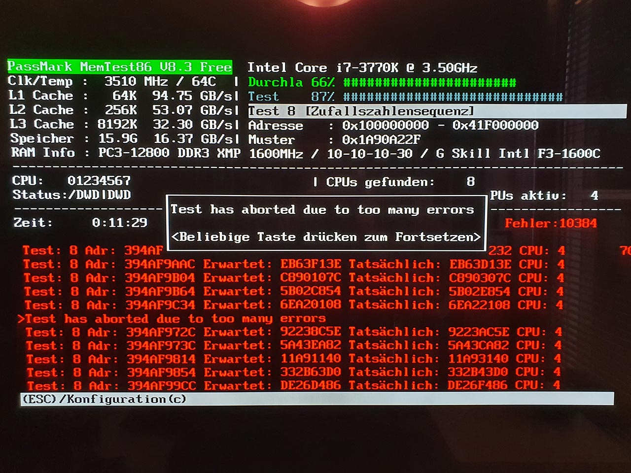 Mein alter Rechner bringt seit einer Woche permanente Bluescreens. Da ich den Speicher (G.Skill Ares 16GB, DDR3-1600) in Verdacht hatte ließ ich Memtest86+ durchlaufen. Der brach den Test dann aber recht bald ab wegen zu vieler Fehler (siehe Foto).