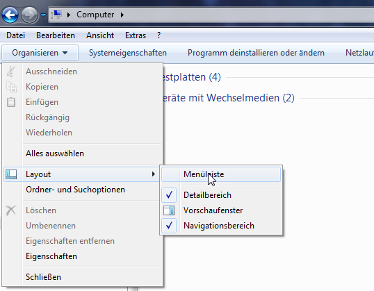 ich habe mal spaßeshalber unter Organisieren/Layout das Häkchen unter "Menüleiste" gesetzt und habe seitdem die besagte Leiste, (die sich sonst über die Alt-Taste temporär einblenden lässt) dauerhaft im Explorer. Wenn ich jetzt diesen Schritt rückgängig machen möchte und das Häkchen dort entferne, bleibt die Menüleiste trotzdem weiterhin bestehen. Mir gelingt es nicht mehr diese (für mich unnötige) Leiste auszublenden. Gibt es da vielleicht einen Trick, um es Rückgängig zu machen, oder muss ich das System jetzt neu aufsetzen