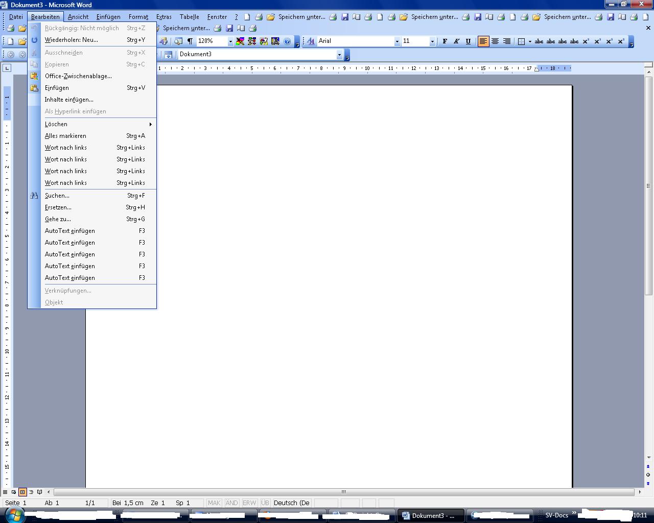 seit einiger Zeit habe ich Probleme mit Word 2003 und doppelten Leisten, angefangen von 1-2 doppelten Leisten sind es jetzt teilweise bis zu 6. Von Zeit zu Zeit wird es sogar mehr und mehr. Auf Bild 1 kann man schön die Leiste oben sehen die 5 fach vorhanden ist, wenn ich die Menuleisten aufklappe (Bild2) sieht man noch besser was ich meine. Diese "Vielfalt" ist auch bei allen anderen Leisten gegeben.