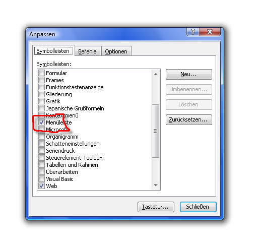 Ansicht > Symbolleisten > Anpassen > Zurücksetzen