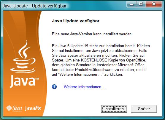 Gestern abend hat sich der JRE-Updater zu Wort gemeldet und wollte meine Version 6, Update 13 auf 6, Update 15 patchen (was ansich schon komisch ist, da es bereits Update 16 gibt).