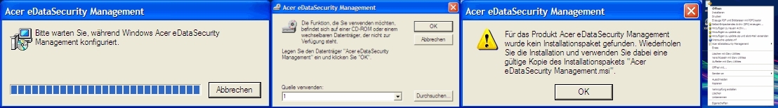 Wenn ich eine Datei oder ein Dokument mit Klick auf die rechte Maustaste löschen möchte, öffnet sich nicht das Kontextmenue sondern es erscheint "Acer eDatasecurity Manegement" und ich soll irgend etwas installieren, was auf CD sein soll. Wenn ich bei dieser Anzeige dann auf abbrechen klicke, erscheint das normale Kontextmenue. Dasselbe passiert übrigens auch, wenn ich etwas markiert habe und die Entfernen-Taste drücke. Die Reihenfolge der Meldungen habe ich mal angehängt. Normale Funktion nur, wenn ich der Reihe nach Abbrechen anklicke.