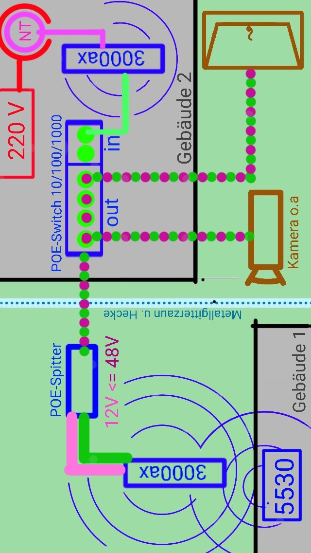 Siehe auch Skizzen der Anhänge.POE-Splitter > zusätzlichem Fritz!3000ax {B} > wlan zu Router 5530
