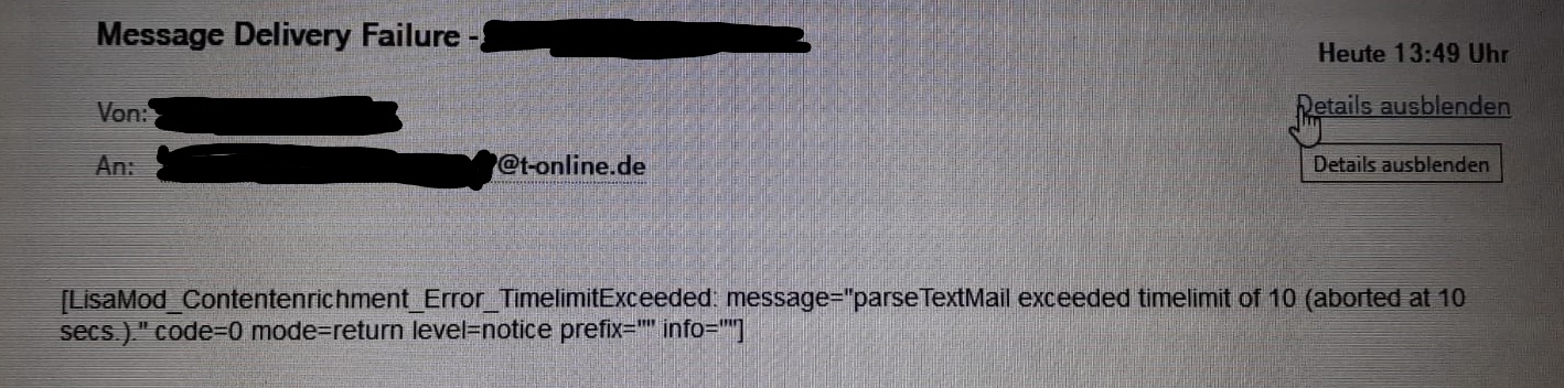 Nun meine Frage: Kann es sein, dass die Fehlermeldung von Ihrem Telekom Account generiert wurde, nachdem das Senden der Mail an mich 10+ Sekunden gedauert hat?