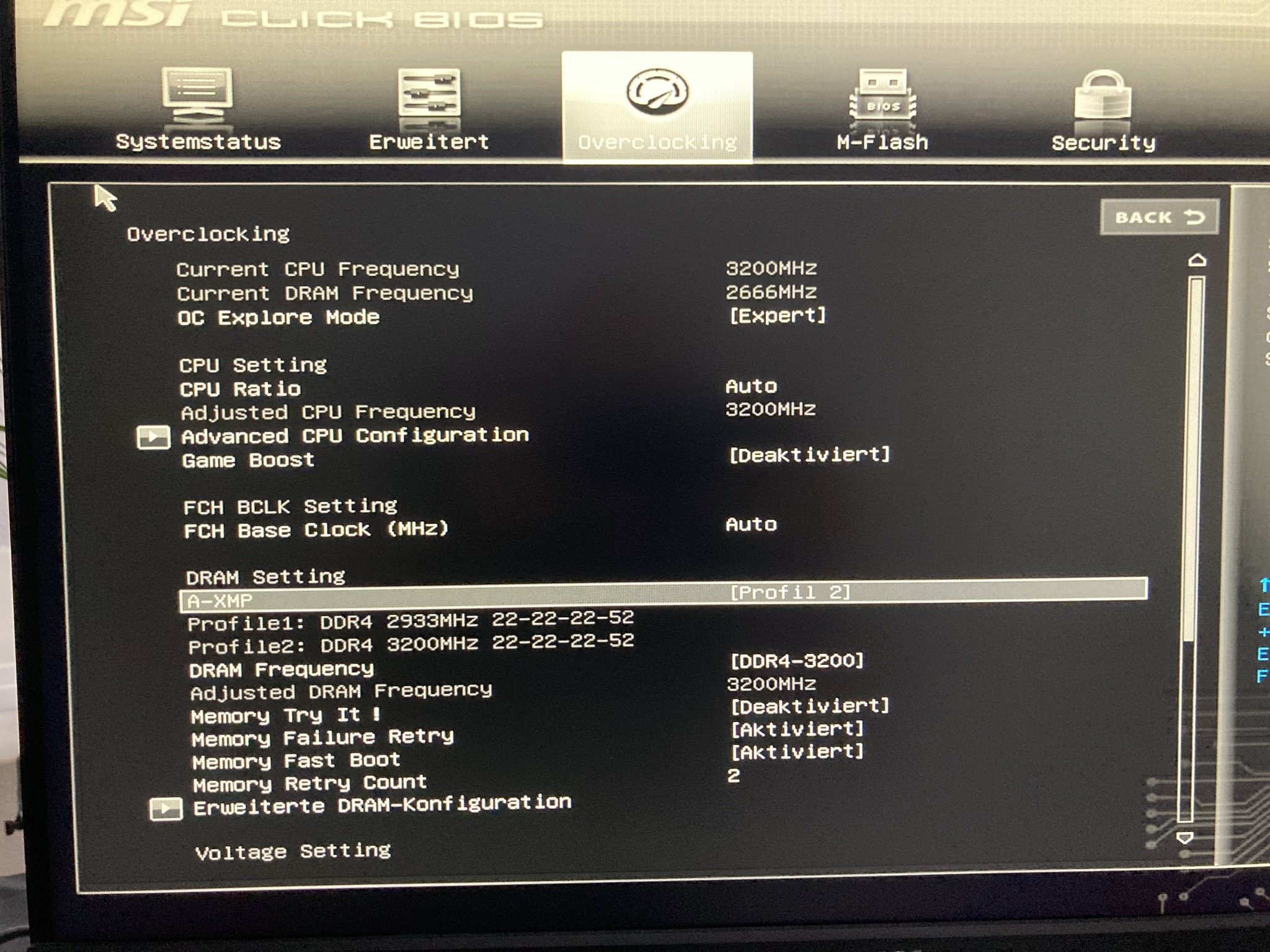 Ich habe ganz sicher die Änderungen gespeichert und ebensfalls die Cmos Batterie gewechelt. Profil 1 habe ich auch schon versucht. Er geht immer wieder zurück auf die Standard 2666 Mhz.