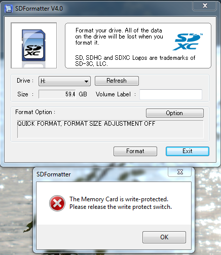 Auch mit dem Programm SDFormatter geht es nicht, weil die Fehlermeldung "memory-card is write-protected"
