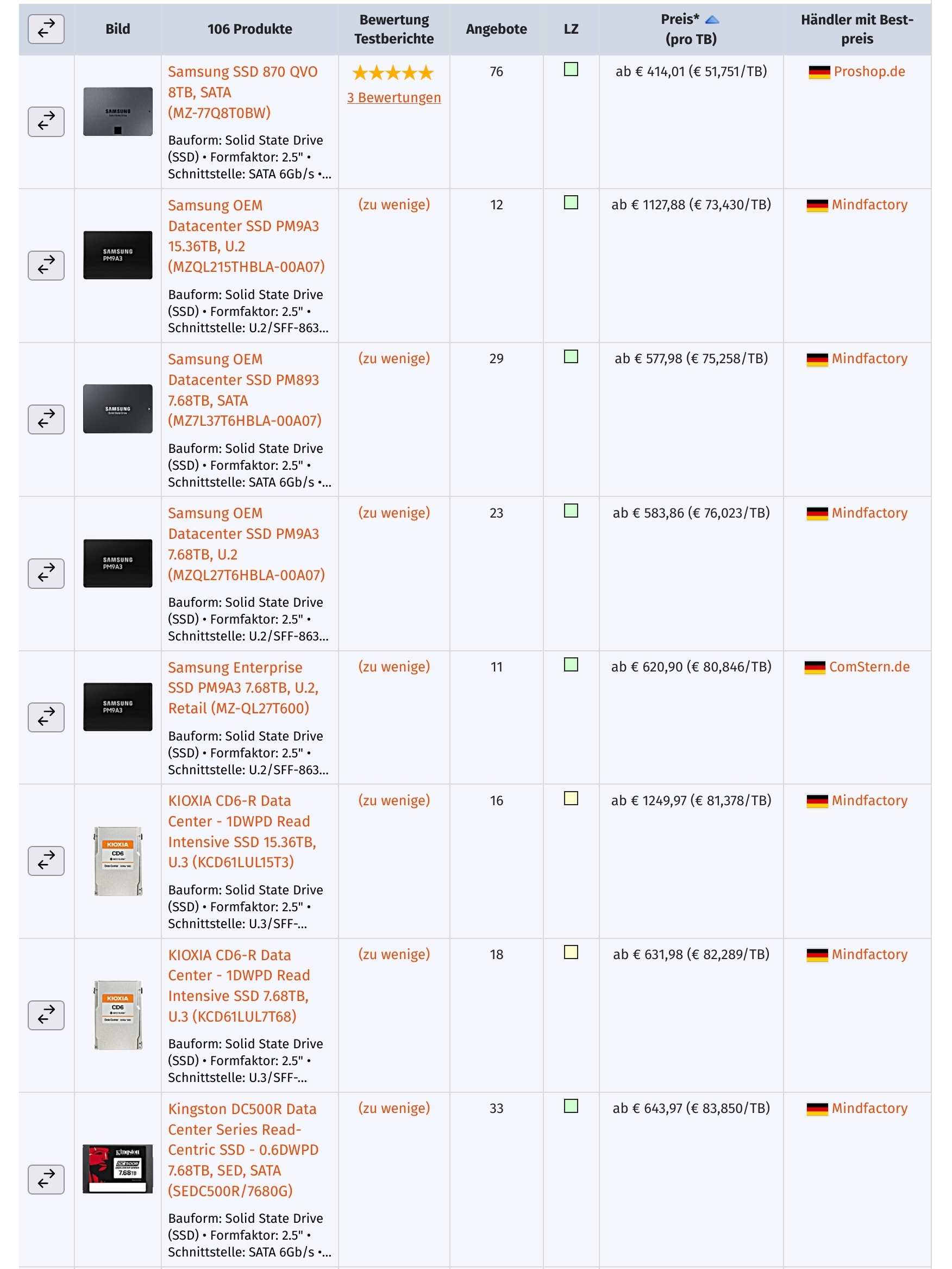 Aber auch so gibt es derzeit 7,7TByte U.3-SSDs für €60/TByte neu und für €50/TByte gebraucht. Ein Bekannter hat sogar ein Schnäppchen für eine gebrauchte 7,7TByte SSD für €307 gemacht. Aber naja, mehr Glück als Verstand.