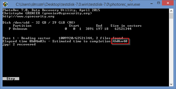 Immerhin wurden schon 2 JPGs innerhalb der ersten 5 Minuten gefunden und auch korrekt recovered - hoffe, dass er hier alles findet.