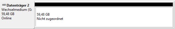 ich habe eine 64GB microSD karte die ich nicht mehr Partitioniert bekomme. Die Karte wird von mir in einem Raspberry Pi verwendet. Ich wollte ein neues OS drauf flashen und habe die vorhandenen Partitionen mit der Datenträgerverwaltung gelöscht um wieder daraus eine zu machen. Sobald ich eine Partition erstellen möchte und ich mich durch das Menü geklickt habe passiert nichts. Auch ist mit aufgefallen, dass 4GB fehlen, da ich nur etwa 60GB Partitioniert kann (siehe Bild). Eine Laufwerkbuchstabe kann ich aber zuordnen, die Karte wird dann auch angezeigt im Explorer, klicke ich drauf erscheint die Meldung "Legen Sie einen Speicher ein". Auch habe ich schon versucht die Karte zu überprüfen ob sie einfach schrott ist.