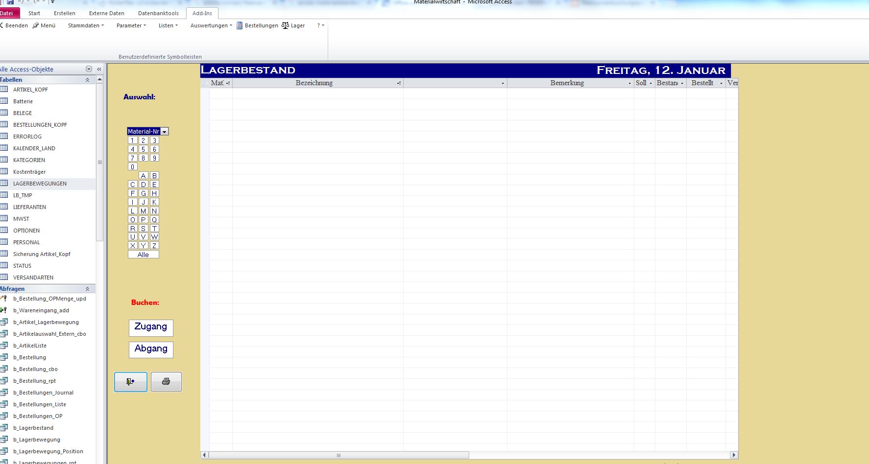 Wir haben eine Materialdatenbank in Microsoft Access (wir nutzen 2010). Diese wurde vor einigen Jahren "fertig" gekauft und von einem Ex Kollegen leicht angepasst. Mittlerweile umfasst diese Datenbank knapp 30.000 Lagerbewegungen. Jetzt würde ich gerne diese Lagerbewegungen alle löschen und quasi mit "einer neuen leeren" Starten. Die Material Liste haben ich in Excel und jetzt will diese Importieren. Naiv wie ich bin dachte ich mir, ich lösche einfach alle 30.000 Datenbank Einträge aus der "Tabelle Lagerbewegungen" und "kopiere" dann meinen neuen Anfangsbestand einfach rein. Wenn ich mir dann allerdings die "Materialliste"