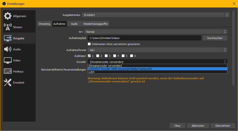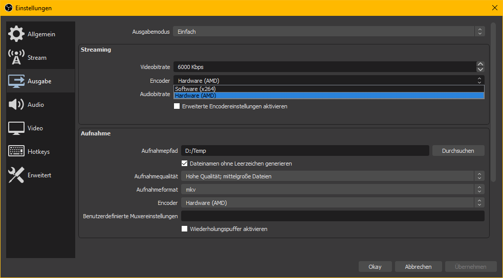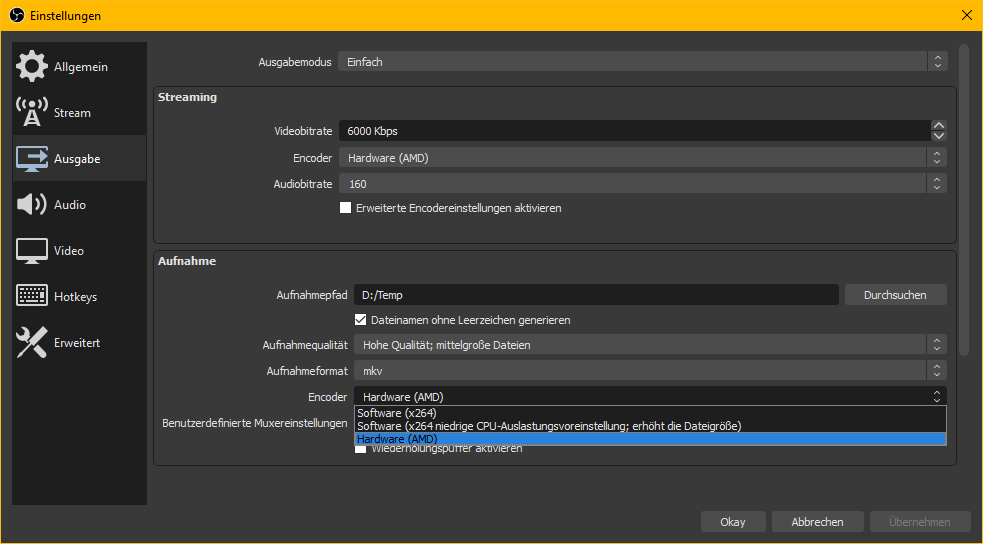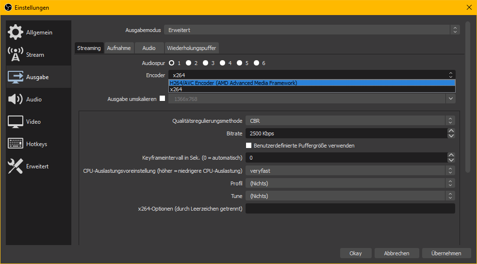 Demnach benutzt OBS wohl automatisch das AMD Adavanced Media Framework. Es gibt aber noch:
