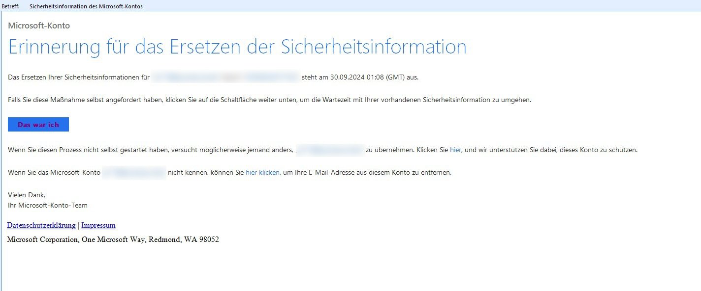 Ich habe am 30.8. die Sicherheitseinstellung im MS-Konto von der hinterlegten Alternativ-Mail-Adresse (die es nicht mehr gibt) auf meine Handynummer umgestellt. Dann kam ein Hinweis, dass ich aus Sicherheitsgründen 1 Monat warten muss bis das umgestellt ist. Soweit verständlich.