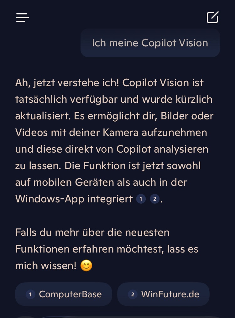 Witzig, ich habe den Copiltor unter iOS gefragt, ob "Vision" schon integriert sei. Zuerst verstand es mich falsch und erzählte mir etwas vom VisionOS für die Apple AR/VR Brille...