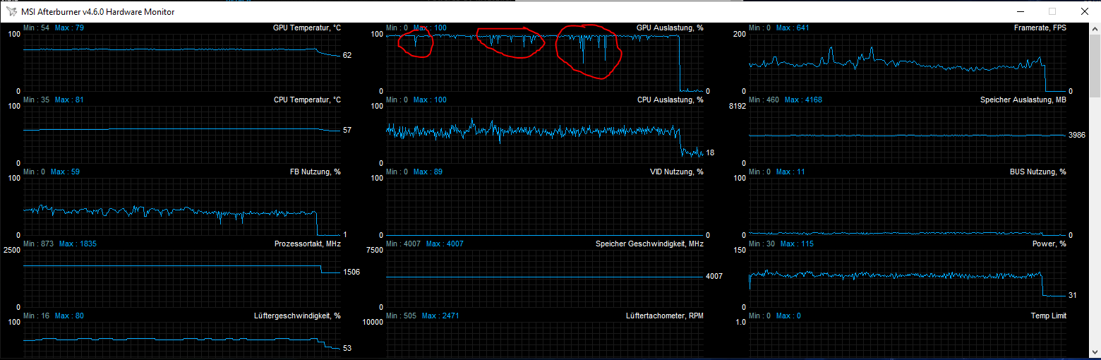 Ich habe euch noch ein Bild angehängt wo mit rot diese GPU usage drops zu sehen sind, die Fps droppen dabei nicht, jedoch habe ich trotzdem einen Microstutter in diesem Moment.