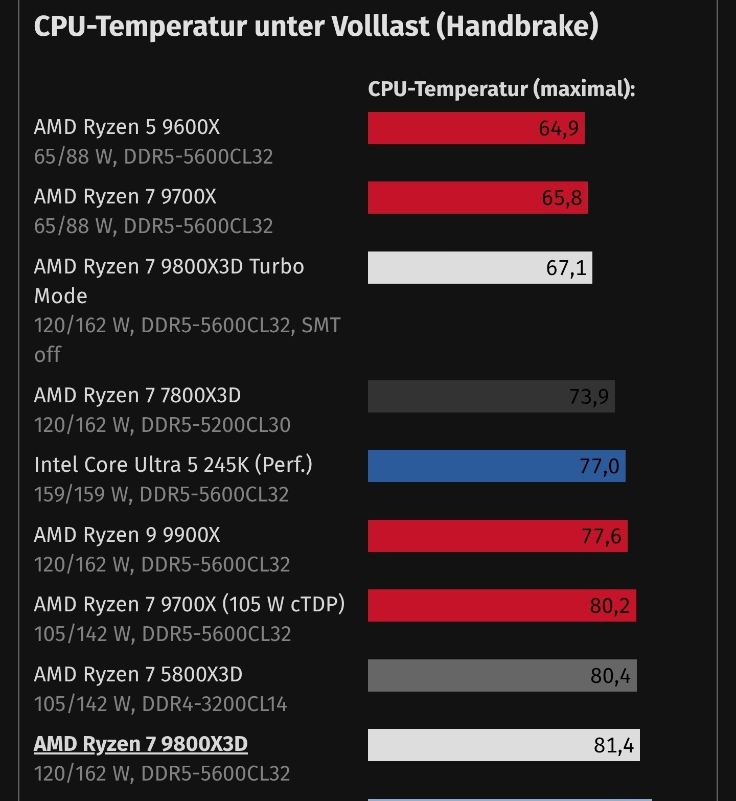 Das ist jetzt aber weit hergeholt. Gut. Computerbase testet auch Stock. Aber was ich so aus der Community (also den diversen Foren) mitnehme, ist schon, dass man den 9800X3D mit einem großen Kühler Stock recht easy in den niedrigen 80°C-Bereich bekommt.coxon schrieb:Was CB misst, entspricht nicht immer der Realität. Wenn es ein Sample ist das vom Hersteller bereitgestellt wird, ist es idR. ein Selektiertes. Das kann man nicht immer auf andere Fälle übertagen.