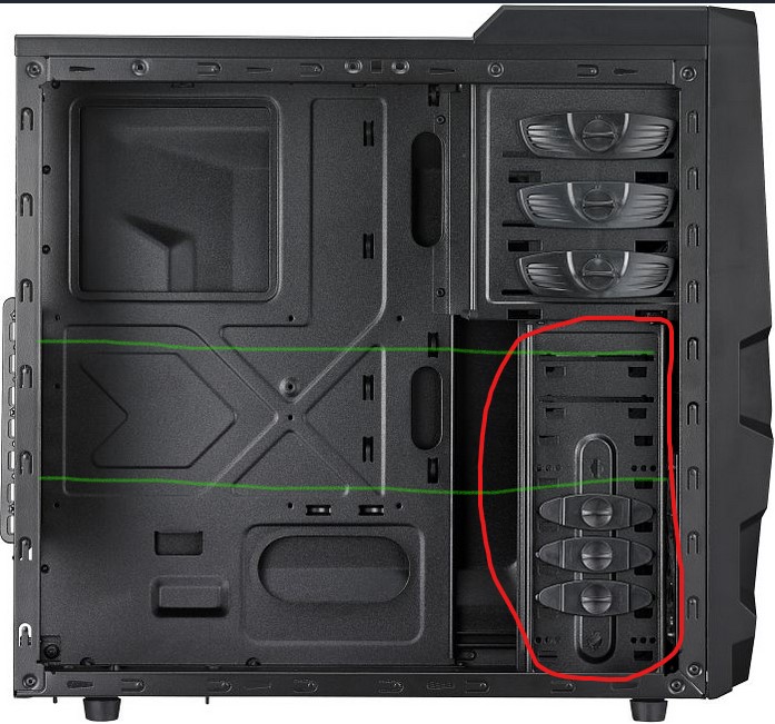 Ich habe mal versucht es zu skizzieren, wenn der HDD Käfig weg (rot) ist wäre dort mehr Platz für längere Grafikkarten (grün).