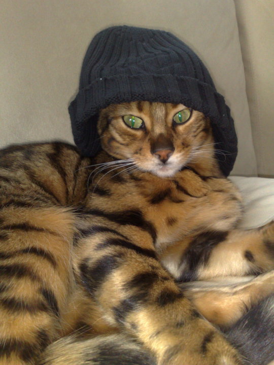"Uhh, ich hab so schrecklichen Hunger. 3 Mahlzeiten am Tag sind zu wenig. Schau mich an, ich besteh nur noch Fell und Knochen. Ich miauz jetzt mal ne halbe Stunde ganz laut, vielleicht bekomm ich dann noch was zu futtern. Oder ich mach aus Protest irgendwas kaputt. Ich knapper mal das Sofa an. Vielleicht merkt der Typ dann endlich, dass ich hier am verhungern bin! Und wieso muß ich hier im Sessel schlafen? Ich will auf dem Schoß von dem Typen da schlafen und alle meine Haare an sein frisch gewaschenes T-Shirt abstreifen. Ich schleich mich an und spring einfach mal von hinten auf ihn rauf. Spätestens beim 6mal läßt er mich schon oben bleiben. Und wenn er mich nicht auf seinem Schoß schlafen läßt und versucht mich runterzuwerfen, dann hau ich einfach wie immer meine Krallen in sein Bein. Dann muß er mich oben lassen."