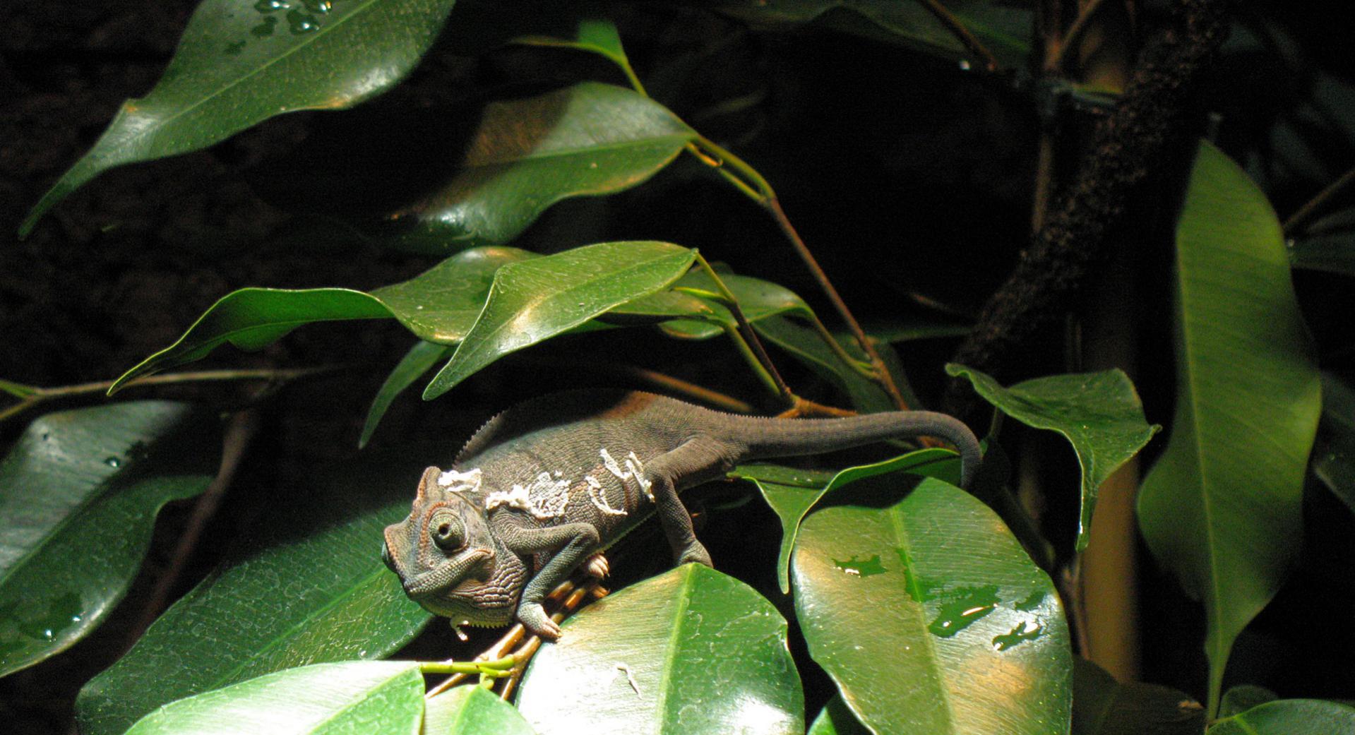 Rechts beim Sonnenbaden, da blähen sich Chamäleons auf (Körper und Kehlsack, seitliche Neigung zur "Sonne") und nehmen eine dunkle Farbe an um Licht und Temperatur mit großer Fläche absorbieren zu können