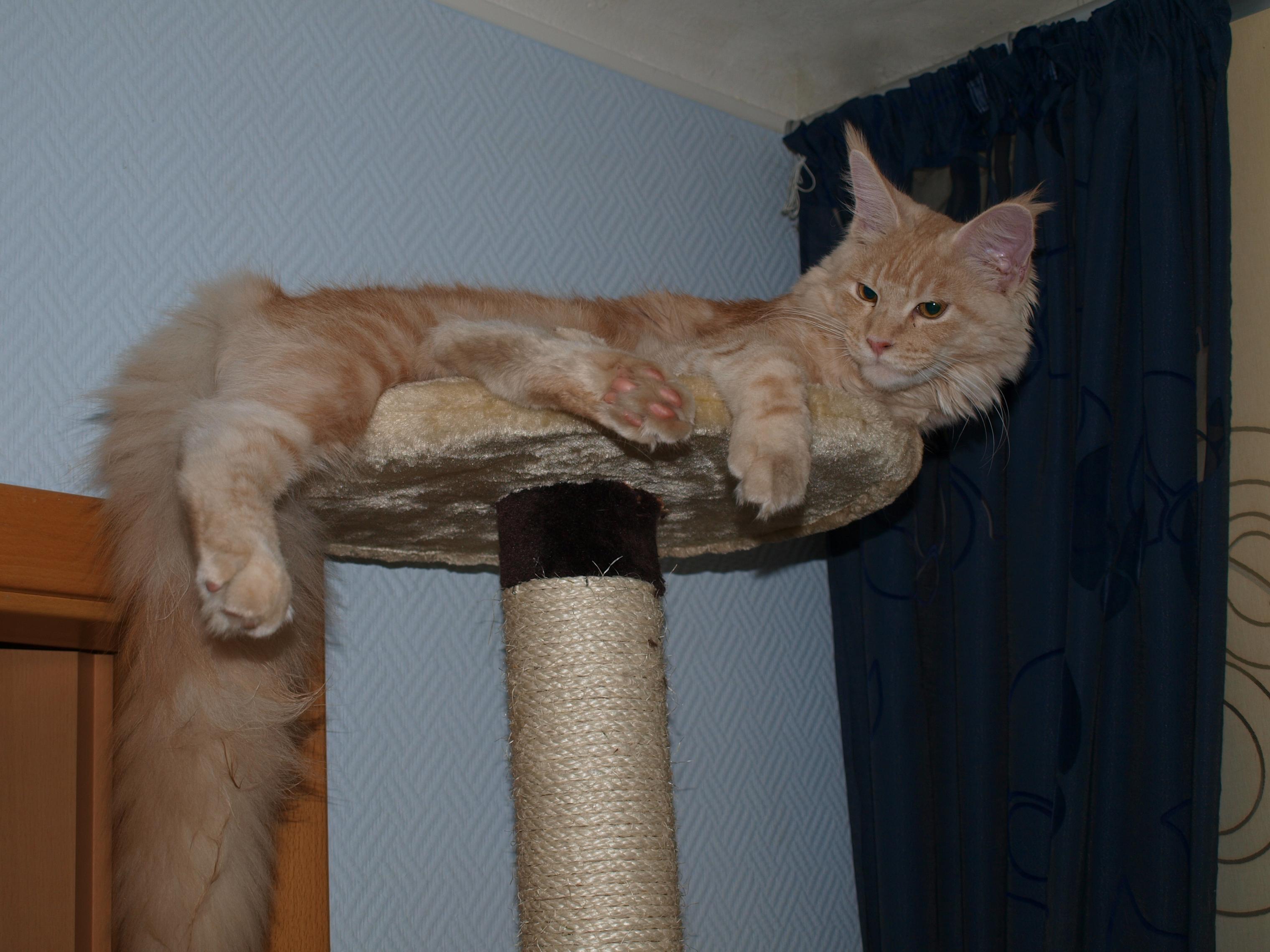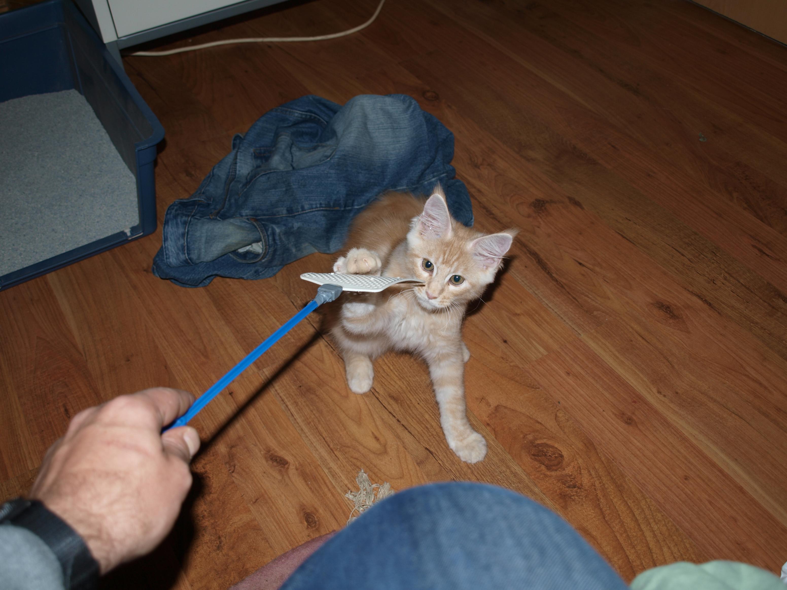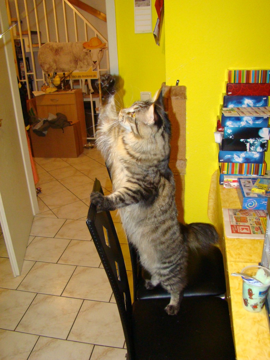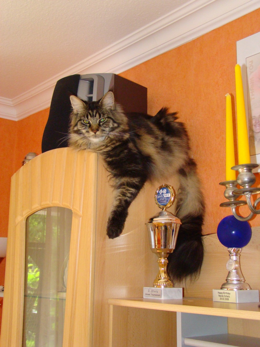 Wir haben auch noch einen Kater zu uns geholt, der ist nun gerade mal 7 Monate alt und wiegt schon um die 5Kg... Leider wurde einer unserer 8 Jahre alten Kater ende Oktober angefahren und ist leider auch über der Regebogenbrücke gegangen, damit der übrig gebliebene sich nicht zu sehr langweilt haben wir uns dann für ein Maine Coon Energiebündel entschieden