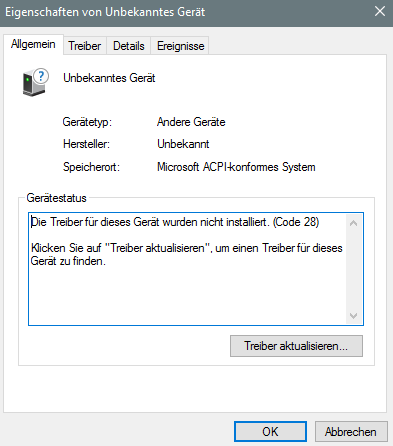 Ich weiß nicht ob es wichtig ist aber im Geräte Manager ist ein "unbekanntes Gerät".