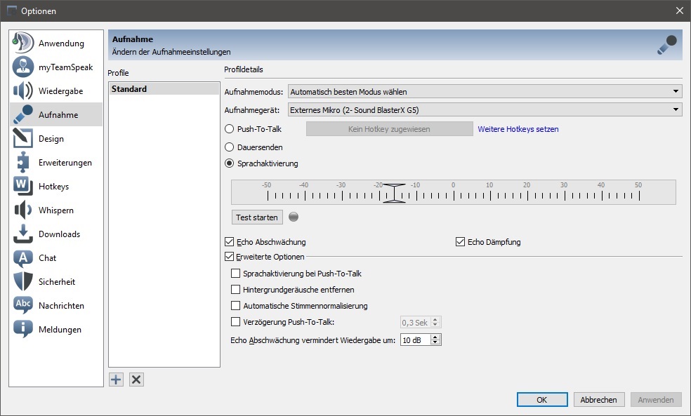 Hallo, ich habe folgendes Anliegen und zwar habe ich mir das Rode NTUSB zugelegt. Um es vor dem Gebrauch im TS usw habe ich mir das Programm Audacity runtergeladen, ein paar Aufnahmen gemacht um zu testen ob meine Stimme ein Echo hat oder Hallt. Ich konnte weder das ein oder andere genannte Problem nicht hören. Als ich dann im TS war sagte man mir das sich meine Stimme anhöre als wäre ich in einer großen Halle. Mit Voicemeter habe ich es dann behoben.