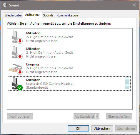 und zwar geht es um das Logitech G430 Headset, welches ich schon länger besitze jedoch kaum benutzt habe. Gestern war es wieder mal so weit und ich wollte dieses in Betrieb nehmen, hab alles angeschlossen, die beiden Klinken in die USB-Treiberkarte und diese in einen USB-Port gesteckt, Headset wurde auch erkannt, Kopfhörer Lautsprecher gingen auch perfekt, jedoch das Mikrofon nicht, dieses wird erkannt und schlägt auch aus, meine Kollegen konnten jedoch nichts hören. Als ich dann das Headset in Skype testen wollte und den Skype-Assistenten anrief, wurde mir direkt per Pop-Up Leiste beim anrufen mitgeteilt, dass mein Mikrofon kaputt wäre und ich doch ein anderes nehmen soll, ich hab dann noch weitere Sachen probiert, hat alles nichts geholfen, höre weiterhin nur alles, Mikrofon ist auch an, es hört mich jedoch keiner und Skype will mir sagen, dass das Mikrofon kaputt wäre. Ich hab dann zum testen, da ich langsam wirklich an einen Defekt des Mikrofons geglaubt habe, unter Windows 10 die Sprachaufnahme Funktion benutzt und siehe da, es ging alles perfekt, meine Stimme war gut zu hören dementsprechend geht mein Mikrofon einwandfrei.