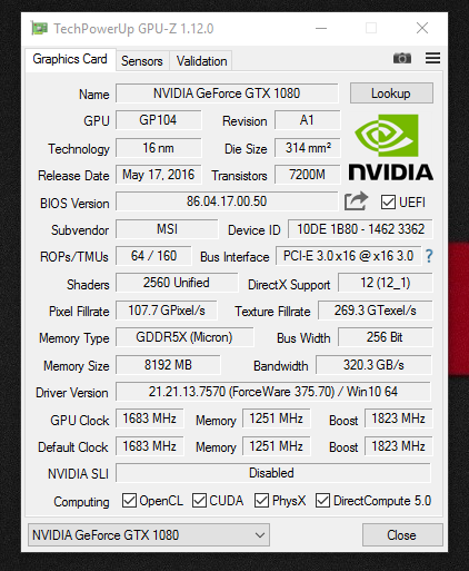 Grafikkarte: 8192MB MSI GeForce GTX 1080 GAMING X 8G Aktiv (Nicht übertaktet)