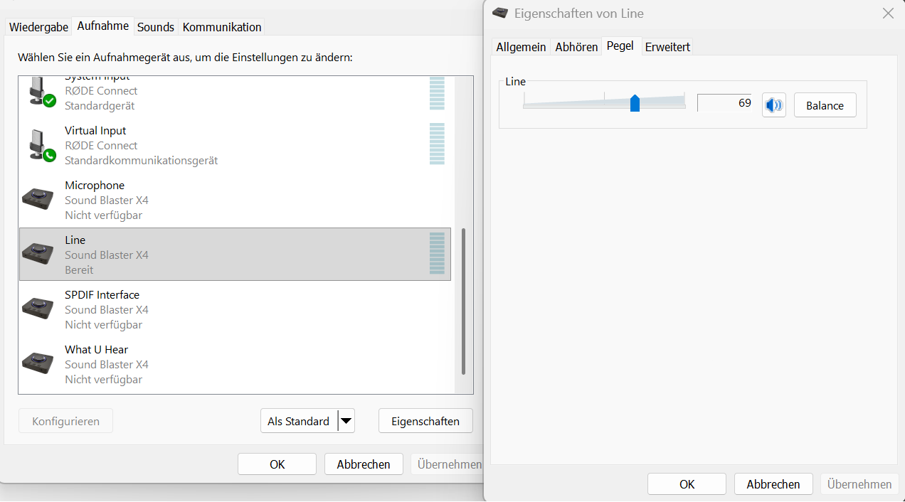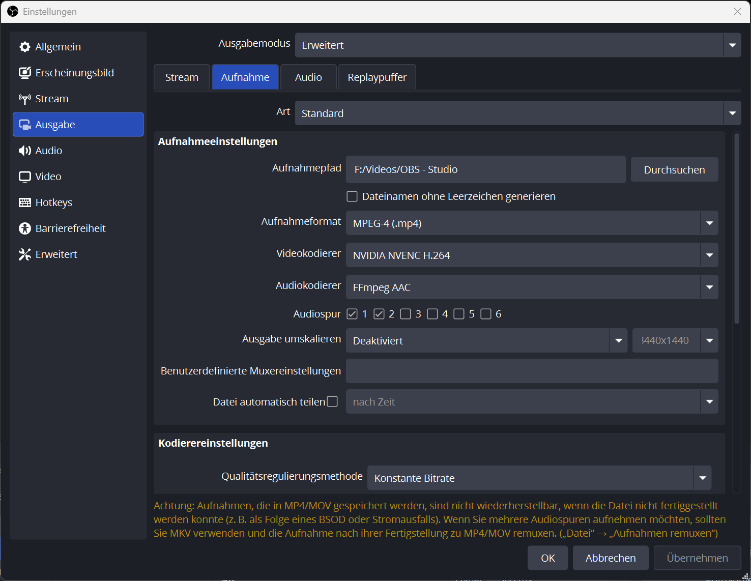 Unter Aufnahme werden dann die Tonspuren mit ausgewählt, die mit aufgezeichnet werden sollen.