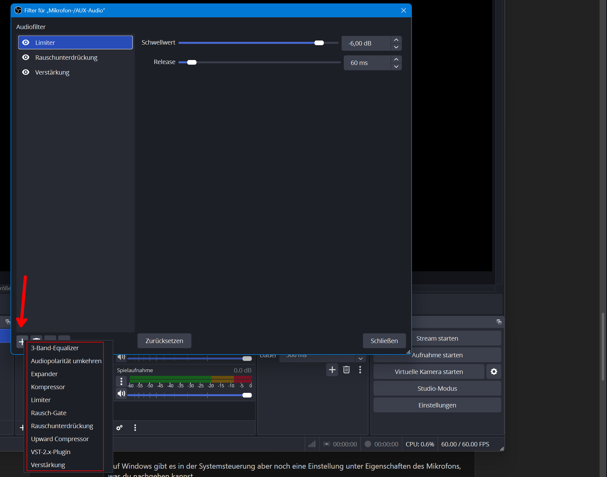 Auf deinem Mikrofon in OBS hast du links drei Punke.