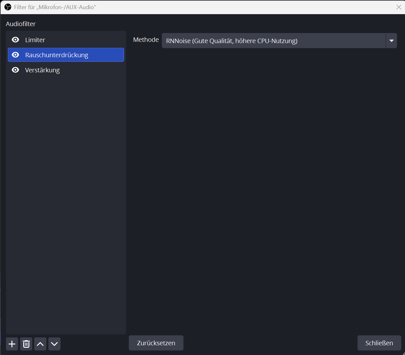 In OBS lässt sich dazu mit einem Filter ein Rauschunterdrücker verwenden.computerbase2 schrieb:Zusatz: Wenn ich meine Videoaufnahme mit aufgenommener Sprache lauter drehe, wird das Rauschen auch immer lauter...