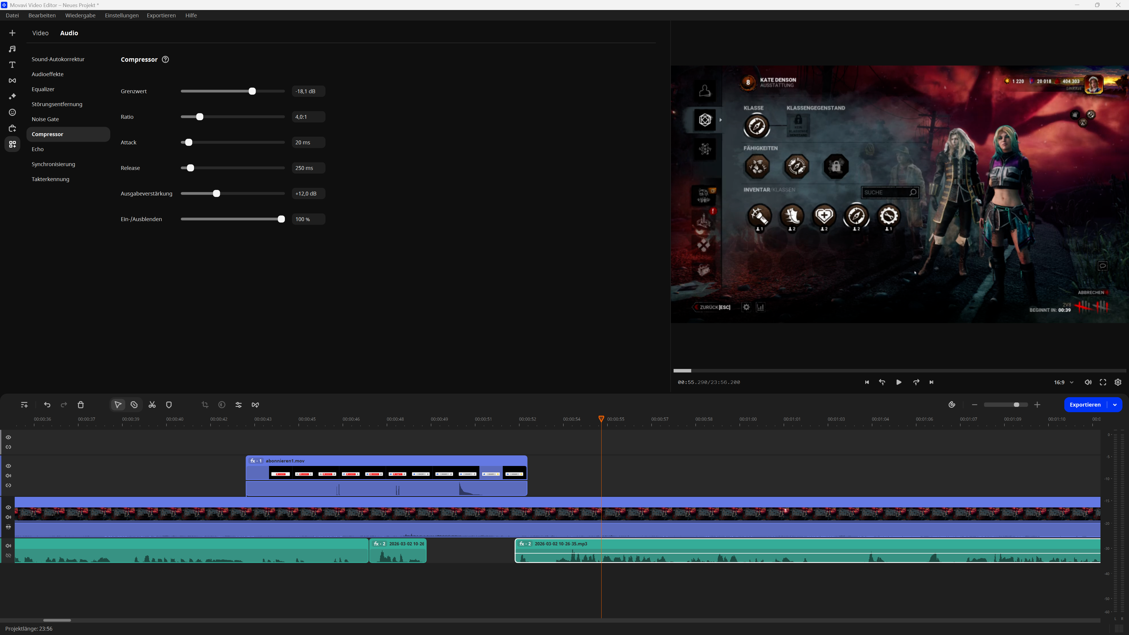 Mit dem Movavi Video Editor 2x lässt sich das Video öffnen und bearbeiten, aber es lädt nur die erste Tonspur. Daher muss ich extra die extrahierte Tonspur mit dazu laden. Das kann ich dann unterhalb der Videospur + Tonspur setzen und es läuft dann auch synchron mit dem Video. Ab hier kann ich beide Tonspuren und das Video nach meinem Ermessen bearbeiten und zum Schluss neu rendern.