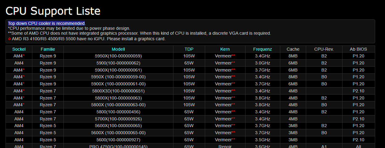 Guter Einwand, wenn man sich die CPU-Kompatibilitätsliste anschaut findet man folgende Einträge:Questionmark schrieb:Hm, wenn ich mir das Board so ansehe, Spannungswandler einfachster Bauart und ungekühlt, da kann ein 5800X nicht wirklich frei arbeiten, diese Kombination gehört verboten!