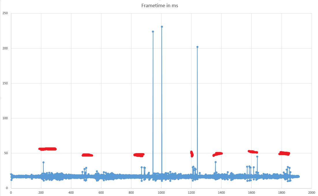 Ich habe auch die Frametimes über einen längeren Zeitraum mit Fraps ausgelesen und grafisch mal dargestellt: