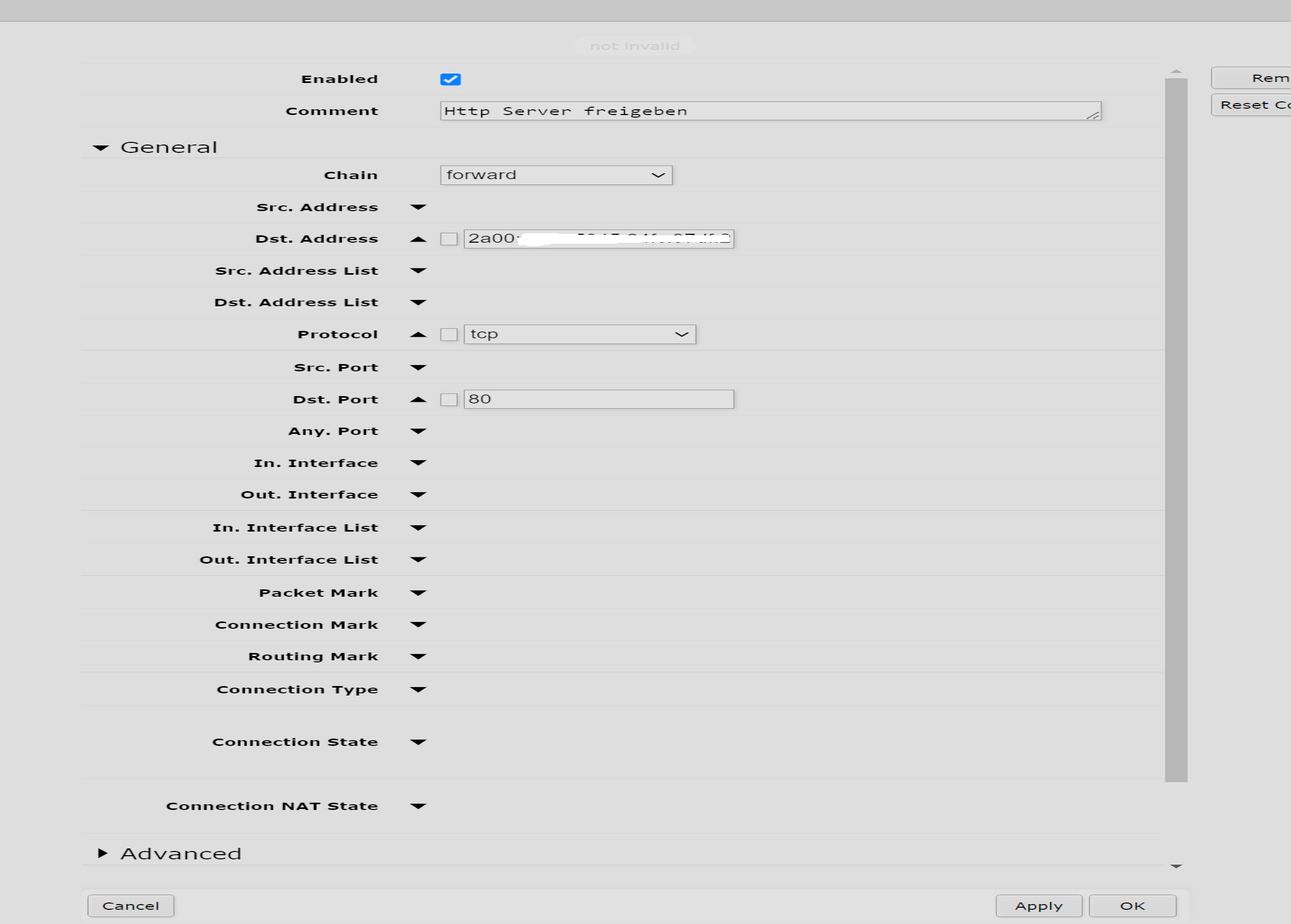Das doofe ist ja, das sich die ipv6 ändert. kann ich irgendwie dem Router sagen, das er automatisch die an den Rechner vergebene ipv6 verwendet? wenn ich bei dst Adresse nichts eingebe, dann würde es gehen, da er dann wohl den Port 80 allgemein für alles öffnet? Dies möchte ich allerdings nicht.