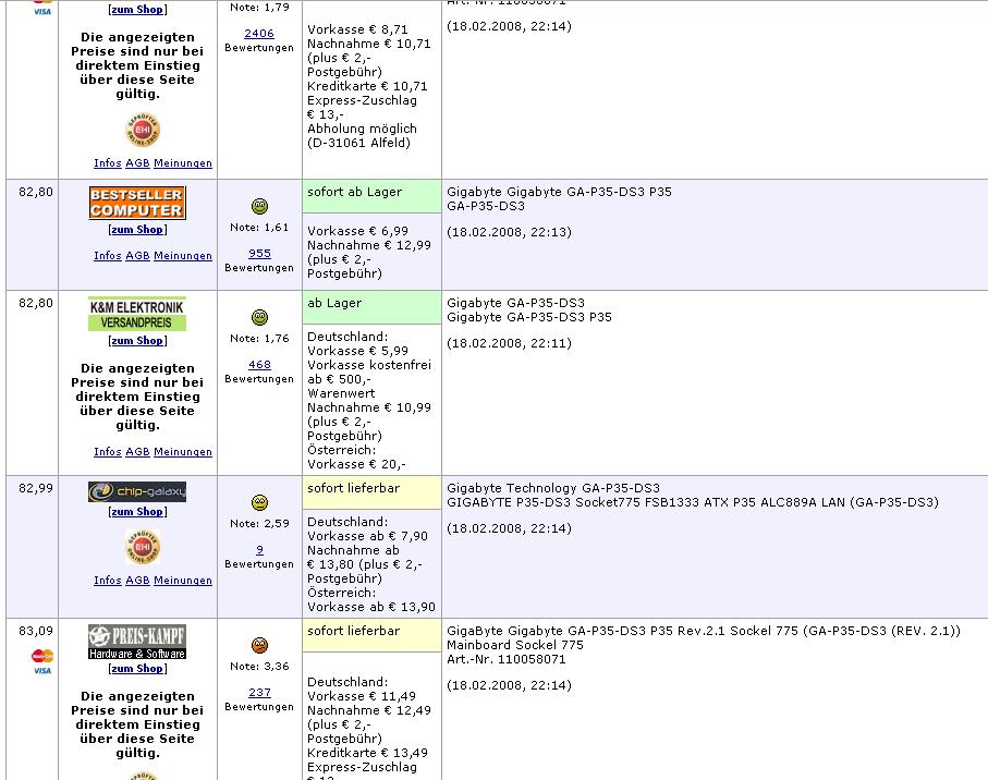 also bei mindfactory sind von heute auf gestern bei fast aller meiner komponennten die ich vor dem 25.02. zur meiner bestellung hinzufügen wollte (e8400) die preise 10-20€ pro teil teurer geworden (billigste 8800gts 270€ :/), habe gemerkt das ie preise bei mindfactory fast täglich sich ändern, wisst ihr eigentlich wieso?, denkt ich ihr es könnte bis zum 25.02. die preise wieder so gut werden wie früher wo wie z.b. bei heise.de/preisvergleich/ bei fast alle teile, mindfactory an der spitze war?