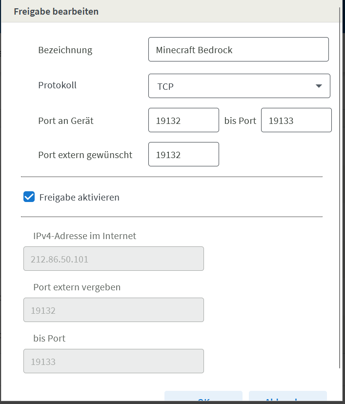 Auf der Fritzbox habe ich den Port 19132 freigegeben. Als Serveradresse nutze ich den dyndns der Fritzbox (.....myfritz.net). Leider kann sich von außen niemand damit verbinden.