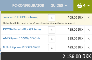Bzw. Komponente kaufen. Ja, Proshop ist dänisch und teurer. Wir haben auch billigere Alternativen wie Compumail.dk. Amazon und Reichelt liefern auch preiswert nach Dänemark