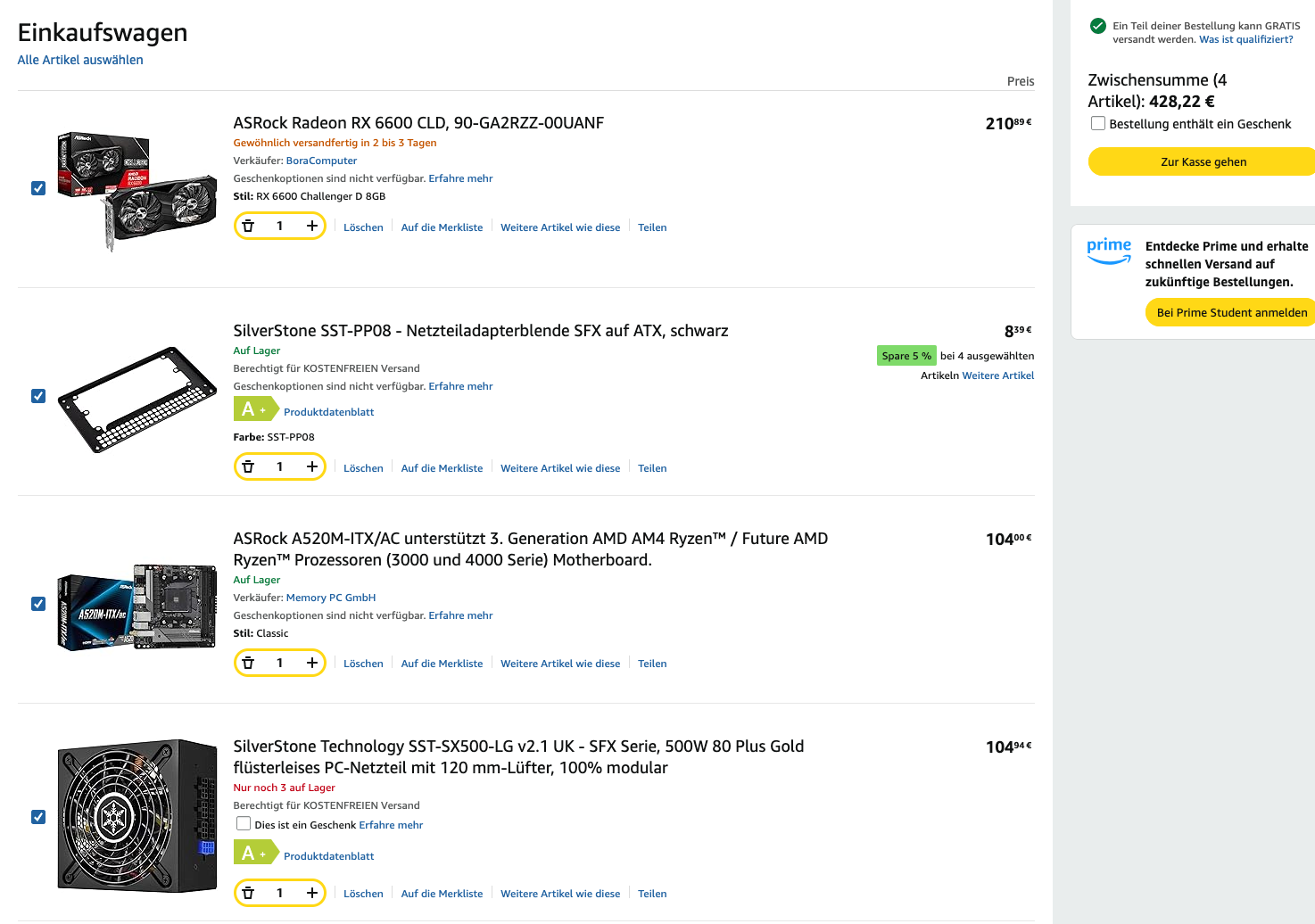 Dennoch glaube ich, dass sie auf längerer Sicht mehr zufrieden mit dem C6 ITX wird. Ich habe jetzt eine neue Liste erstellt (https://geizhals.de/wishlists/4445735), mit der RX 6600 als Ausgangspunkt, jedoch werde ich mich umschauen, ob wir doch nicht eine bessere Grafikkarte gebraucht finden können.