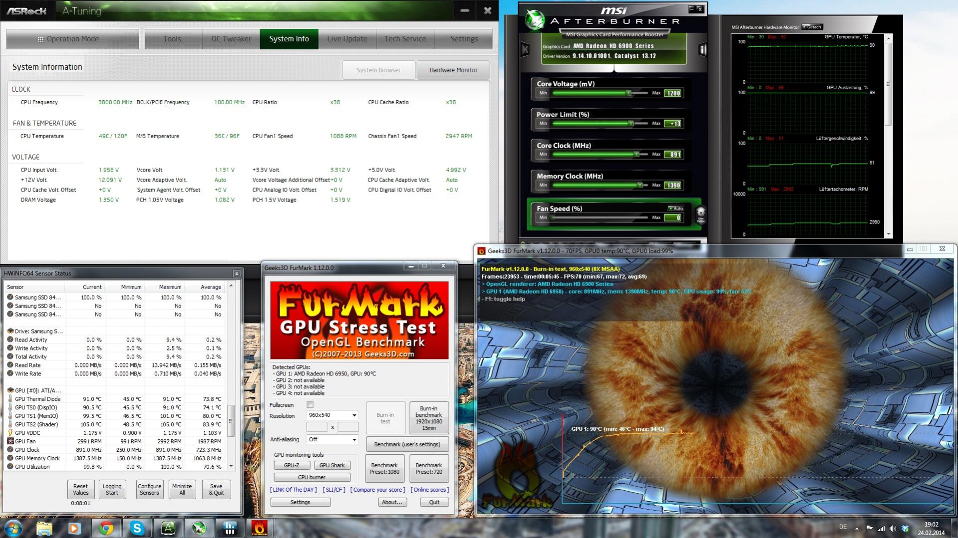 Die Grafikkartentemperatur hängt natürlich von der Taktrate (hier AMD 6950@ 6970 und noch mal übertaktet) und der gewünschten Lautstärke ab. Die automatische Lüftersteuerung pegelt die Grafikkartentemperatur immer bei 90°C ein. Da hört man aber die Grafikkarte leider deutlich. Das Konzept ist aber für die Grafikkarte gemacht. Also bei einem Kühler mit 3 Axiallüftern würde viel Luft ins Gehäuse gehen und damit noch die Luft vor dem Radiator erwärmen. Deswegen ist der Radiallüfter an dieser Stelle ziemlich gut geeignet. Leider ist er ziemlich laut. Alternativen kennt keiner zufällig? Also einen leisen Radiallüfter?