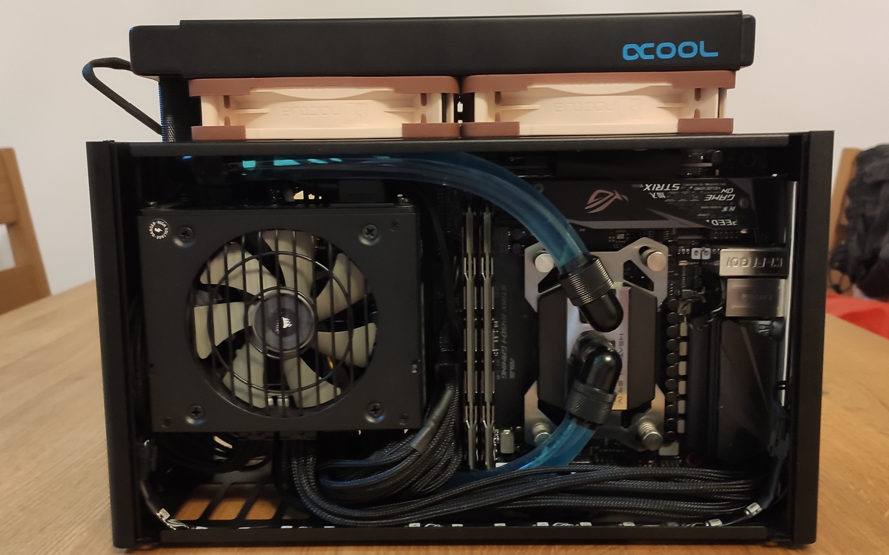 Die Kühlleistung ist natürlich schlechter als bei deinem System, weniger platz, kleinere Radiatoren etc., aber das macht im Endeffekt Leitungsmäßig kaum etwas aus, wenn ich OC Rekorde schlagen will baue ich keine Mini-ITX.